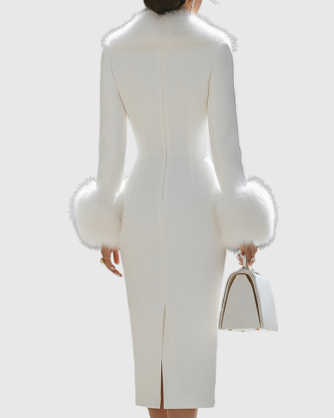 Step into timeless sophistication with this pristine white trimmed midi dress — the epitome of refined luxury. Featuring plush faux-fur accents at the collar and cuffs, it blends modern tailoring with classic winter allure. The fitted silhouette flatters effortlessly, making it a show-stopping choice for elegant evenings, winter gatherings, or formal occasions.